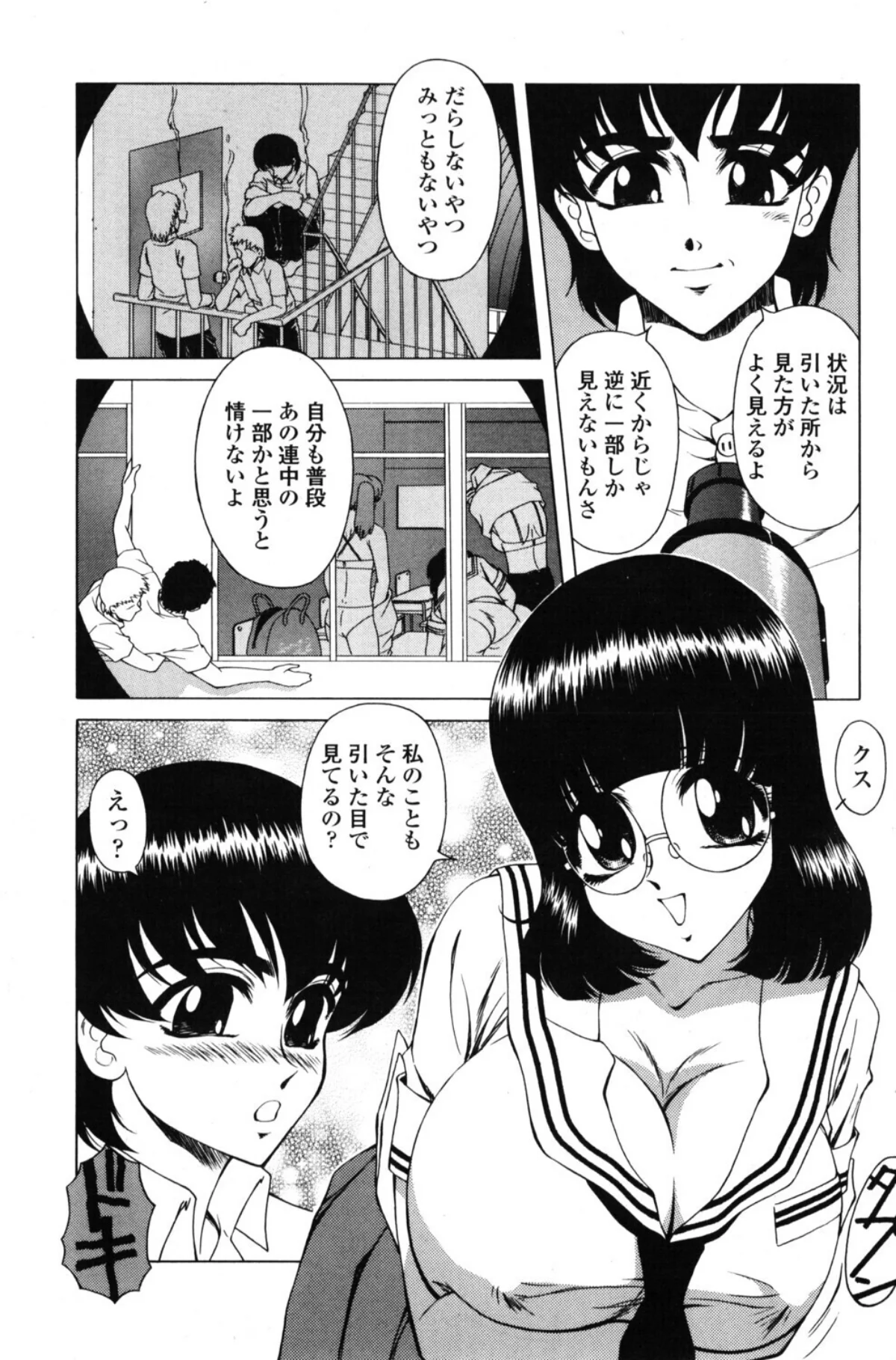 表向きは真面目な女子校生として過ごしているヒロインが、実は全く違う顔を持っているという設定が秀逸です。制服を着た巨乳美少女の二面性に、読者は完全に翻弄されてしまいます。普段の清楚な表情から一転、誰も知らない彼女の本性が露わになる瞬間の描写は圧巻。快楽に溺れていくヒロインの表情変化が、1コマごとに丁寧に描かれていて、その豹変ぶりに興奮が止まりません。眼鏡をかけた知的な印象とのギャップも相まって、背徳感が倍増します。