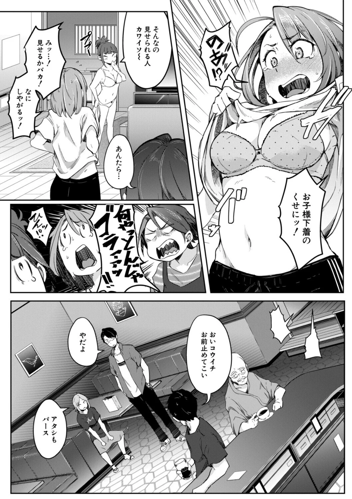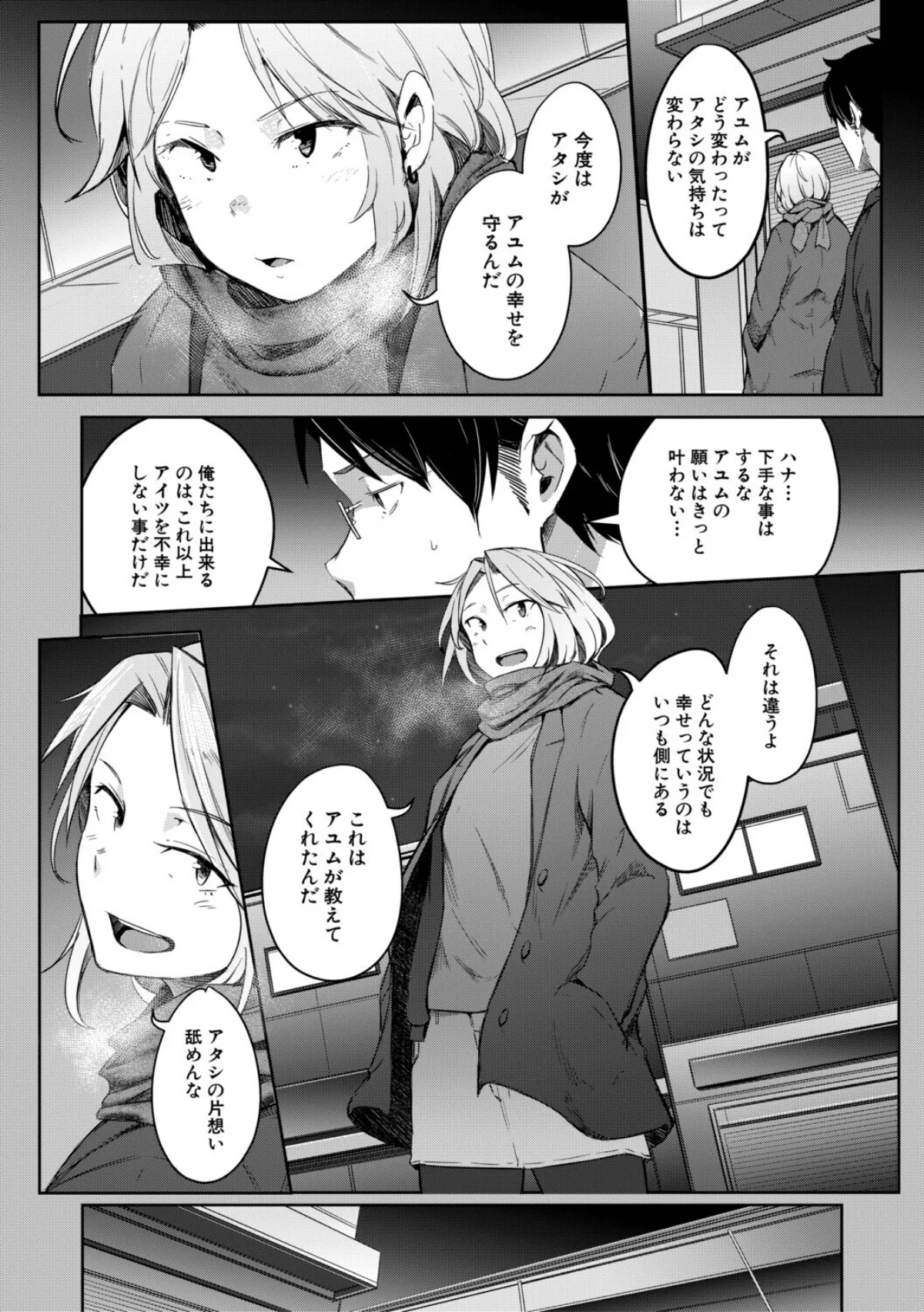 アユムの女体化をきっかけに、4人の関係性が劇的に変化していく様子が見どころです。今まで男友達として接していたコウイチが、女性になったアユムに対して異性として意識し始める心境の変化が繊細に描写されています。一方でスズネとハナも、それぞれ異なる感情を抱きながら状況を受け入れようとする姿が印象的です。理性が崩れていくプロセスが段階的に描かれており、1ページごとに読者の緊張も高まっていきます。単純な性的関係ではなく、長年の友情があるからこその葛藤や、新しい関係性への模索が丁寧に表現されており、読んでいて感情移入せずにはいられません。