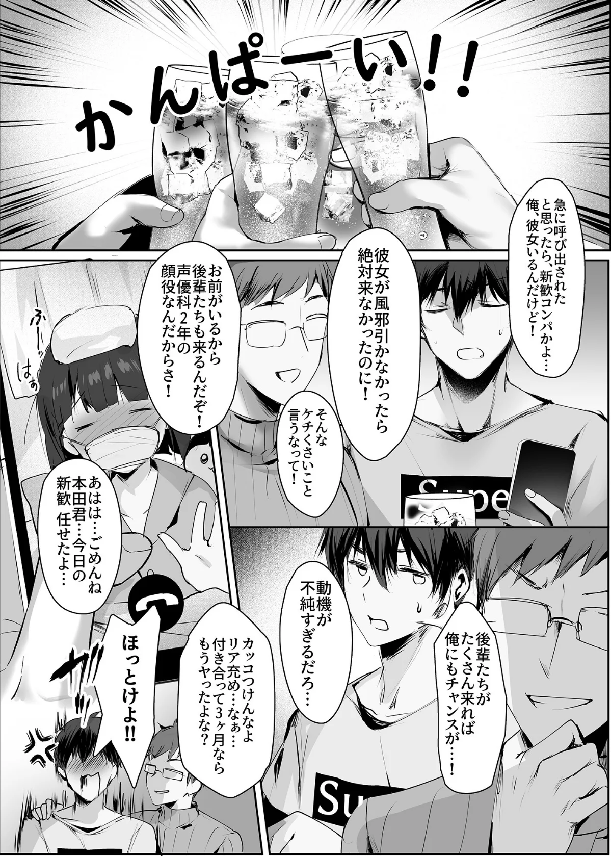 新歓コンパの夜、声優科2年の本田は、後輩の櫻井莉奈から声をかけられる。彼女は可愛らしい外見と甘い笑顔を持ちながら、どこか危険な色気を漂わせていた。「先輩、家まで送ってくれませんか?」という一言が、彼を甘美な罠へと誘い込む。挑発的な瞳と熱を孕んだ吐息が、理性を焼き尽くし、抗えない快楽の檻へと堕ちていく。巨乳の魅力を持つ莉奈との禁断の関係が始まる。
