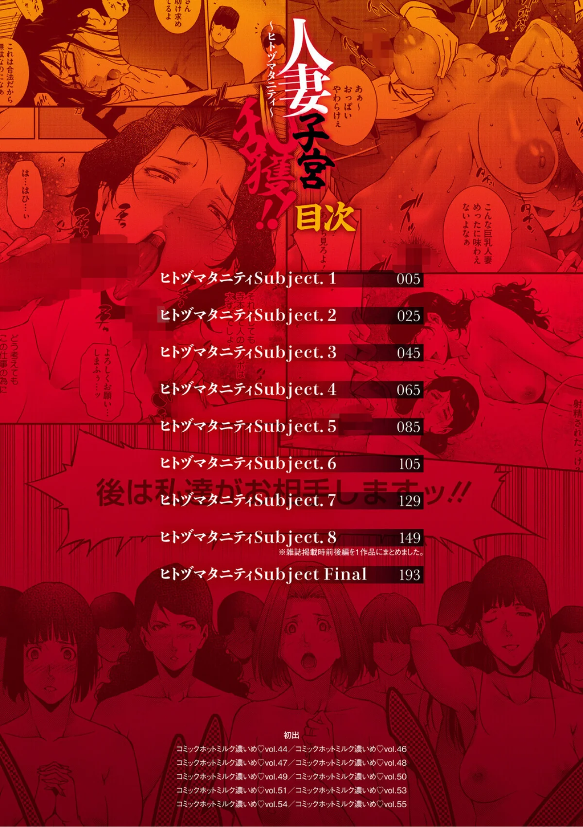 少子化対策法「ヒトヅマタニティ」により、妊娠可能な人妻たちはフリーセックスと膣内射精が義務付けられ、外出時には結婚指輪を外すことも許されない状況に置かれます。買い物に出かけるだけで、複数の男に精子を注ぎ込まれる人妻たちの姿が描かれ、夫以外の男との関係が常態化しています。この作品は、人妻たちが孕むまでの過激なシチュエーションを通じて、淫乱な世界観を楽しむことができます。