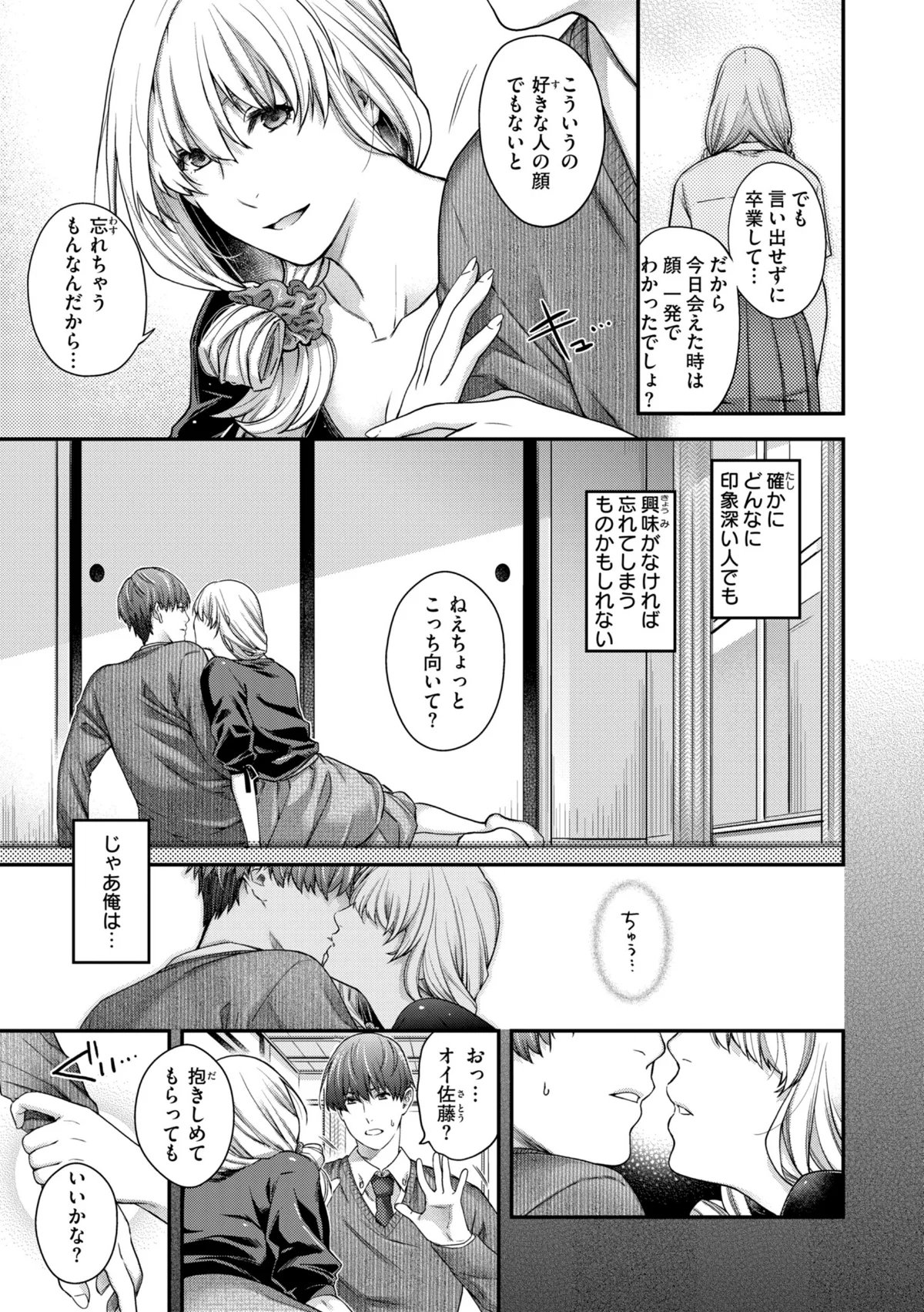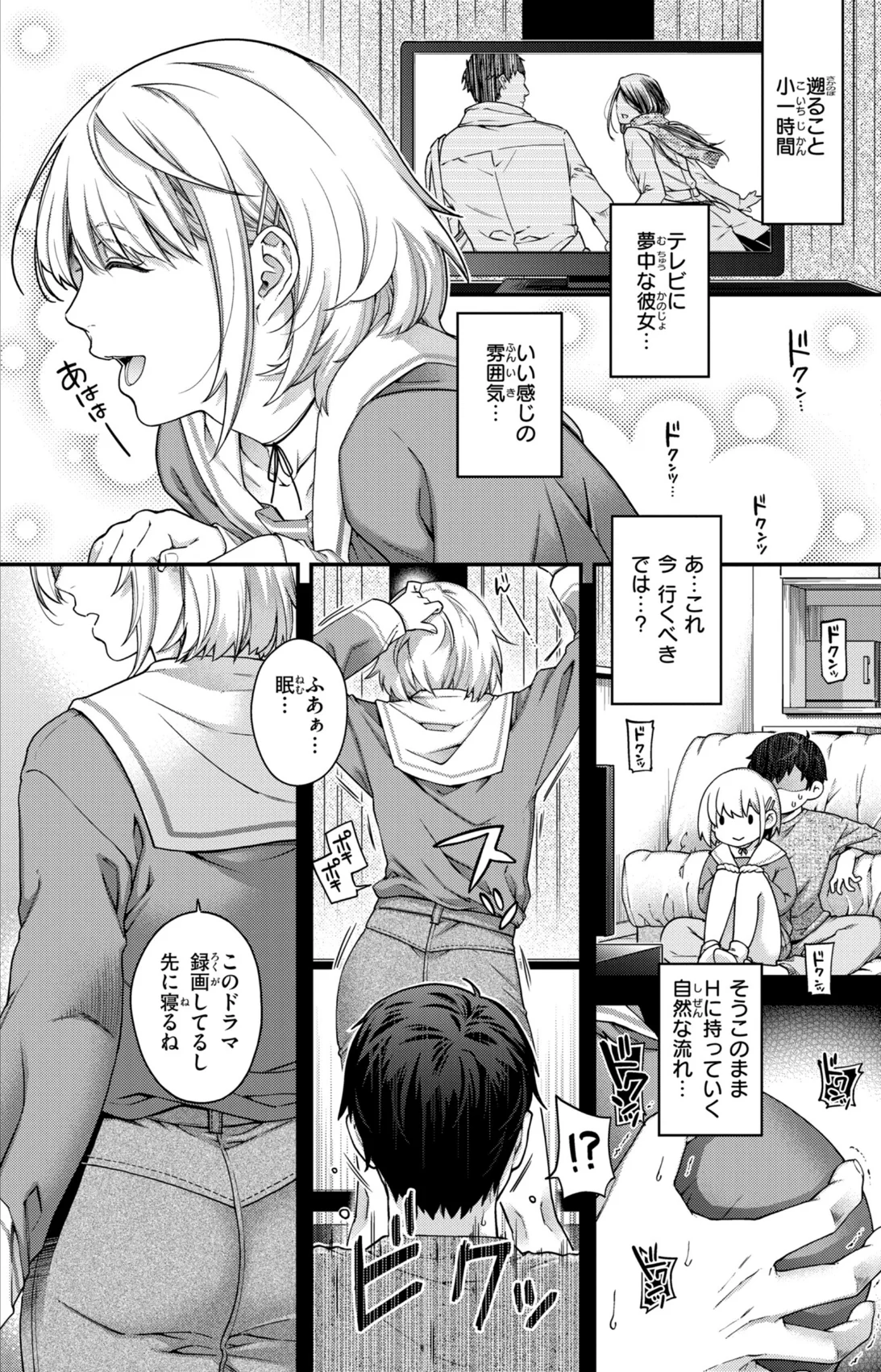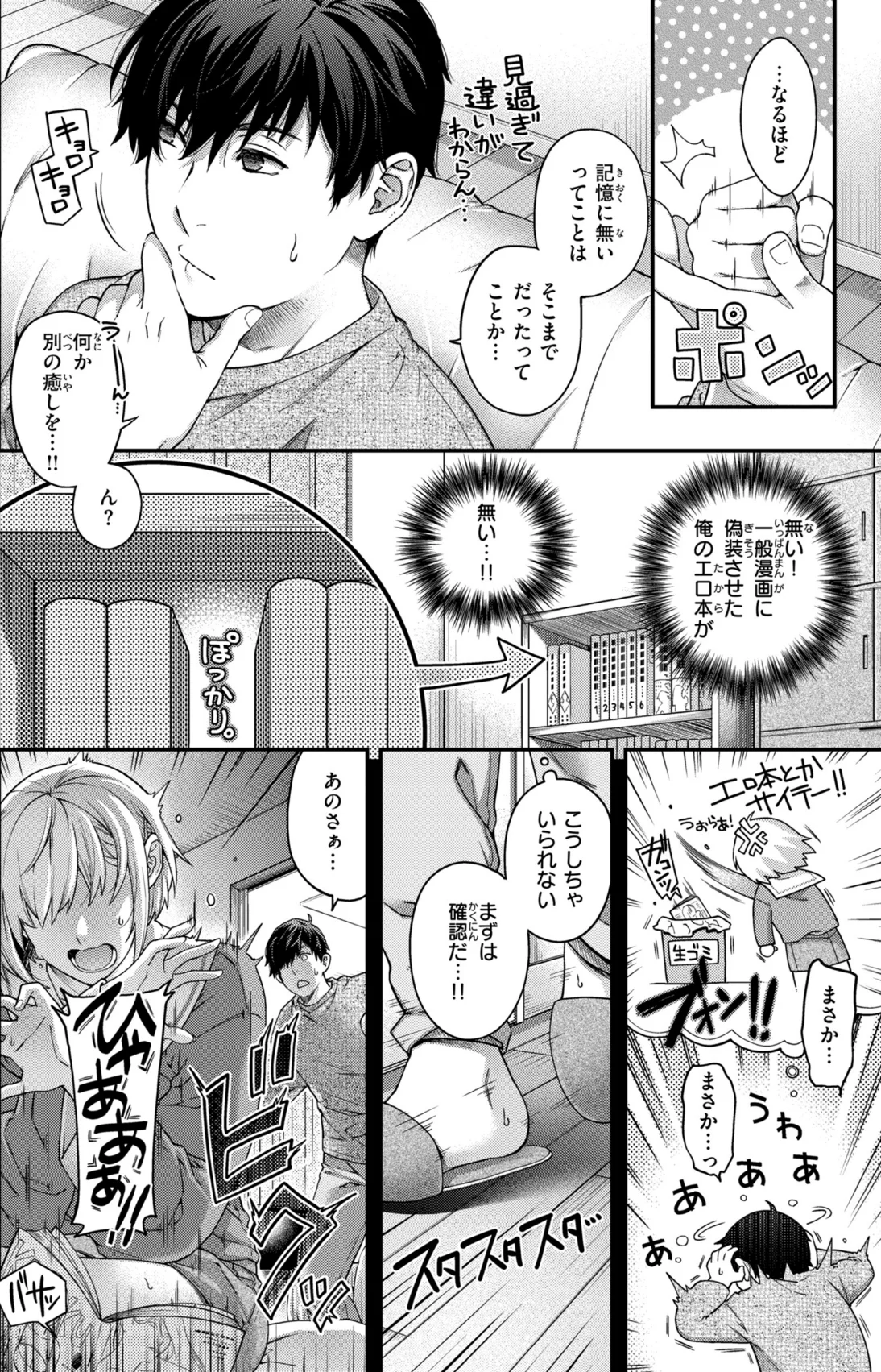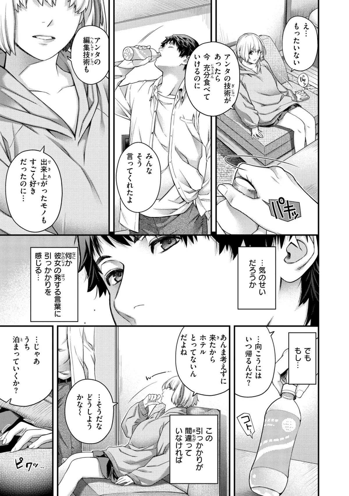 本作の最大の特徴は、どのエピソードも「ありそうでなかった」絶妙なシチュエーション設計にあります。地元の職場に突然現れた元カノが配信者になっていたり、営業先で再会したクラスメイトの未亡人が妖しい雰囲気を漂わせていたり——非日常が日常の隙間にするりと入り込んでくる感覚がたまりません。特に『偽りの誠』の「先月、主人が亡くなっちゃってね」という一言から始まる展開は、読んでいる側の心臓をぎゅっと掴んでくる引力があります。処女・未亡人・幼なじみ・ギャルと属性もバラバラなのに、作品全体を通して「シャングリラ(理想郷)」という統一感が漂っているのが不思議で心地よく、気づけばページをめくる手が止まらなくなっています。