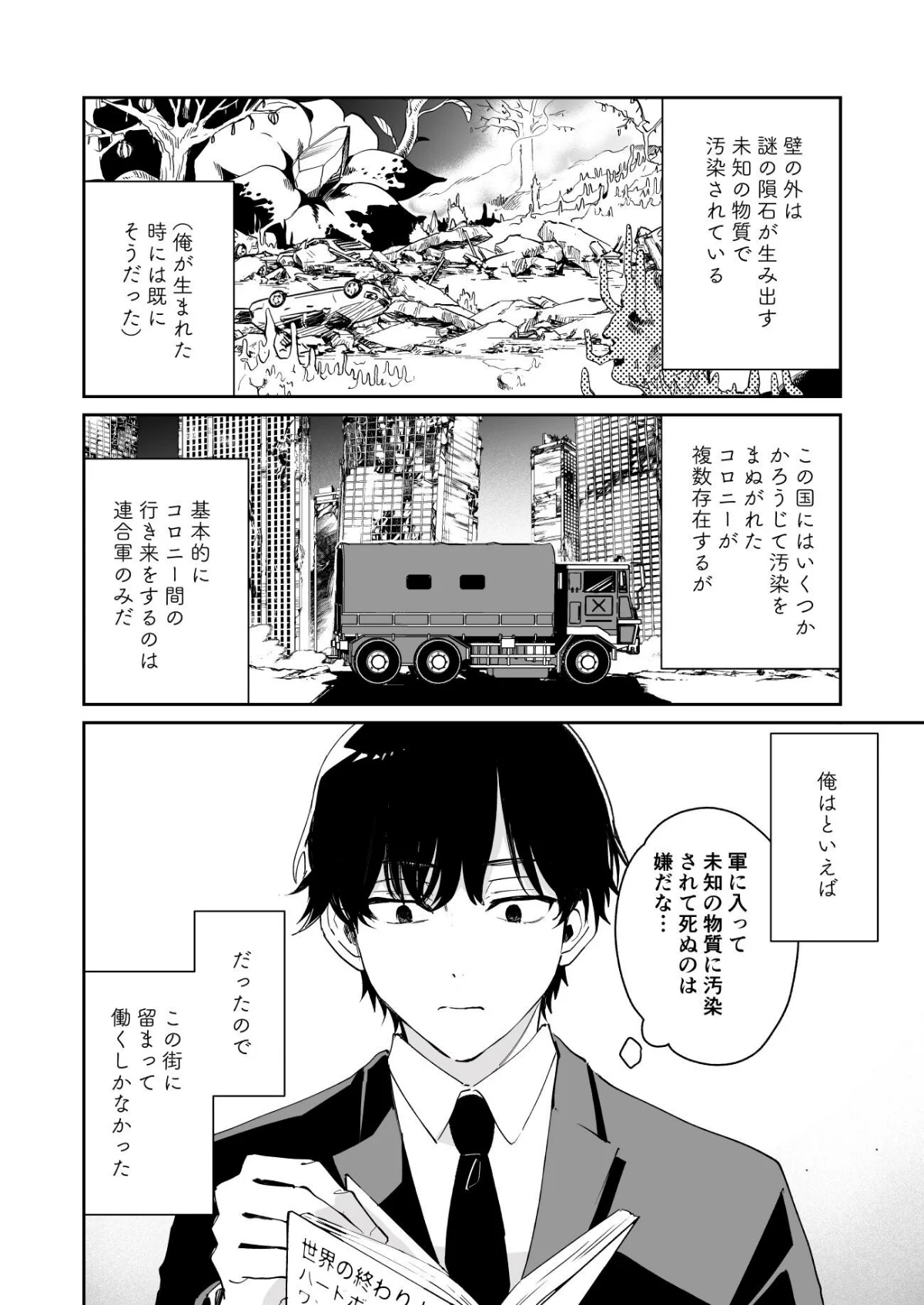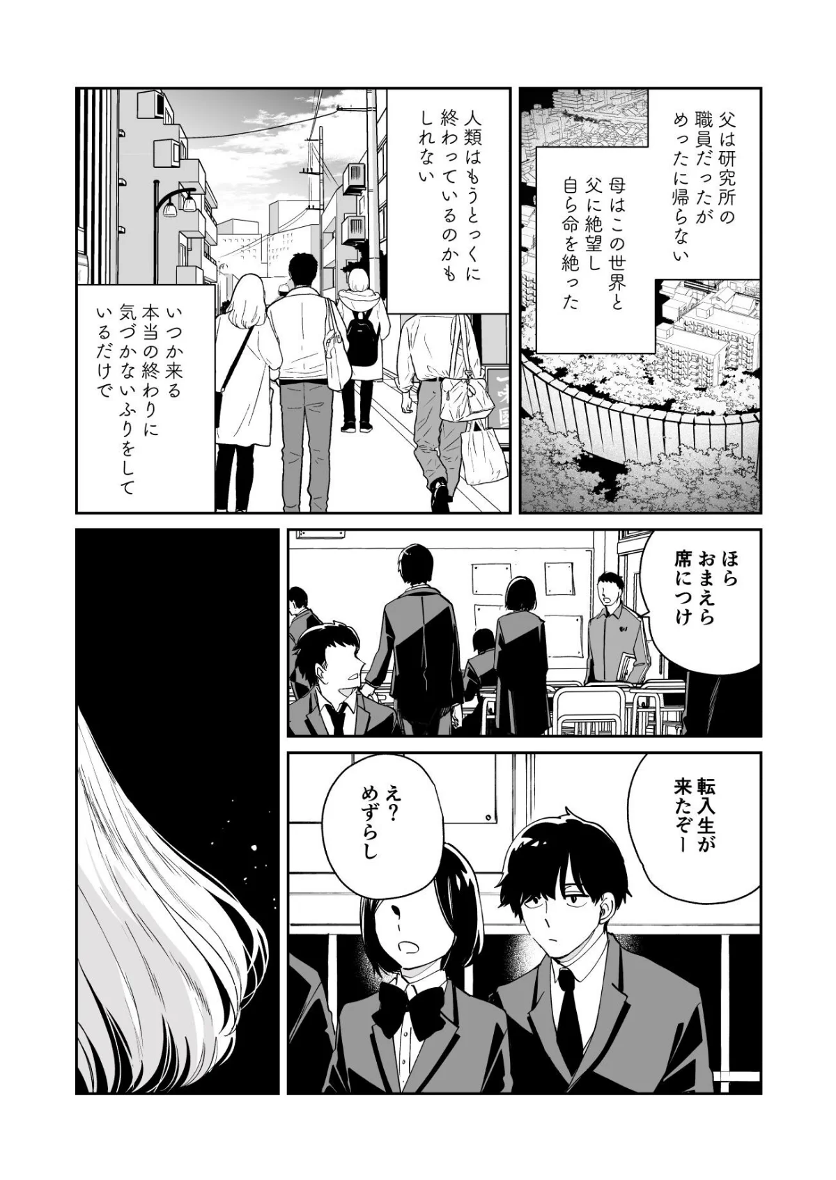普通の男の子と人外触手宇宙人美少女の純愛を描いた作品で、00年代のセカイ系・ラノベの雰囲気を持つSFファンタジー・ラブストーリーです。物語は、壁に囲まれた街や謎の隕石によって汚染された外の世界、研究所、宇宙人、そして謎の転校生が登場する独特のシチュエーションで展開します。小さな病室で少年が少女に出会い、恋に落ちる様子が描かれています。