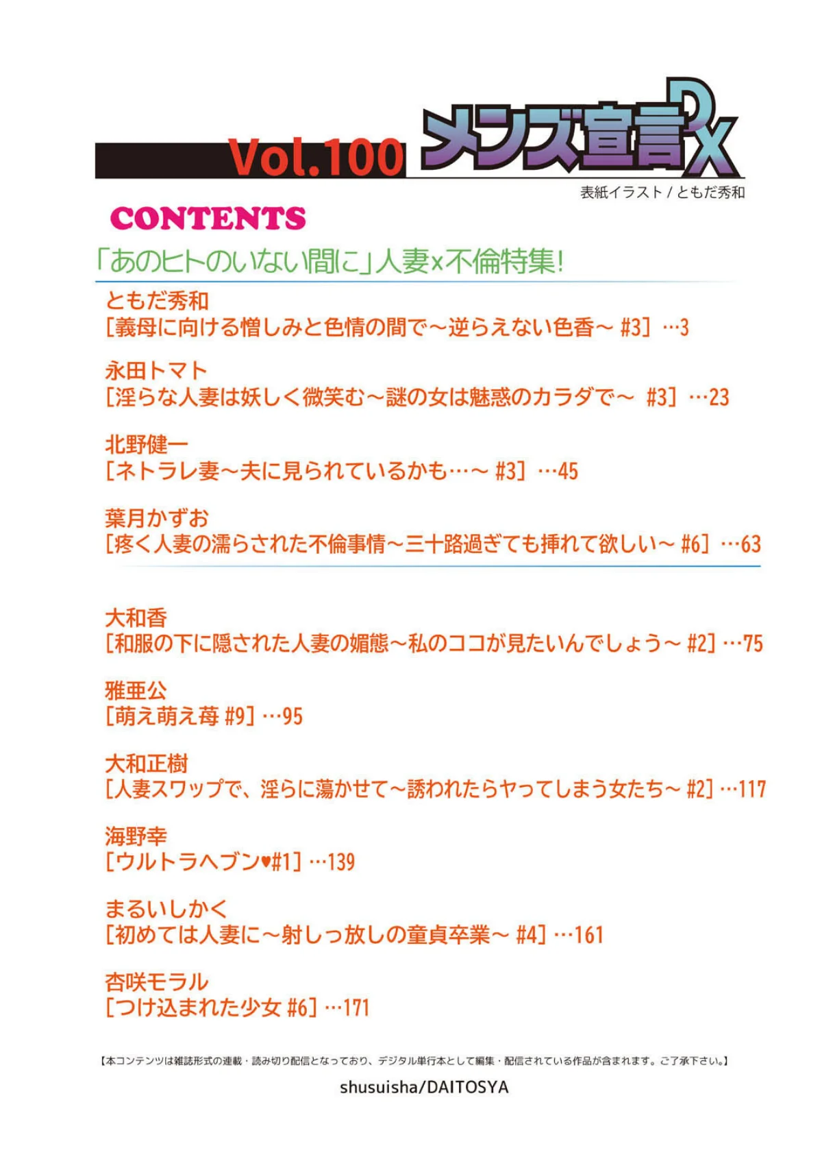 vol.100記念として「人妻×不倫」をテーマにした特集号です。表紙を飾るのは、ともだ秀和による義母との禁断の関係を描いた作品。永田トマトの謎めいた魅惑的な人妻もの、北野健一のネトラレシチュエーション、葉月かずおの三十路人妻の切ない不倫模様など、多彩な人妻ストーリーを収録しています。大和香の和服美人妻、大和正樹のスワップもの、まるいしかくの童貞卒業ストーリーなど、様々な作家陣が織りなす大人の恋愛関係とエロティックな世界観が楽しめるマンガ誌となっています。
