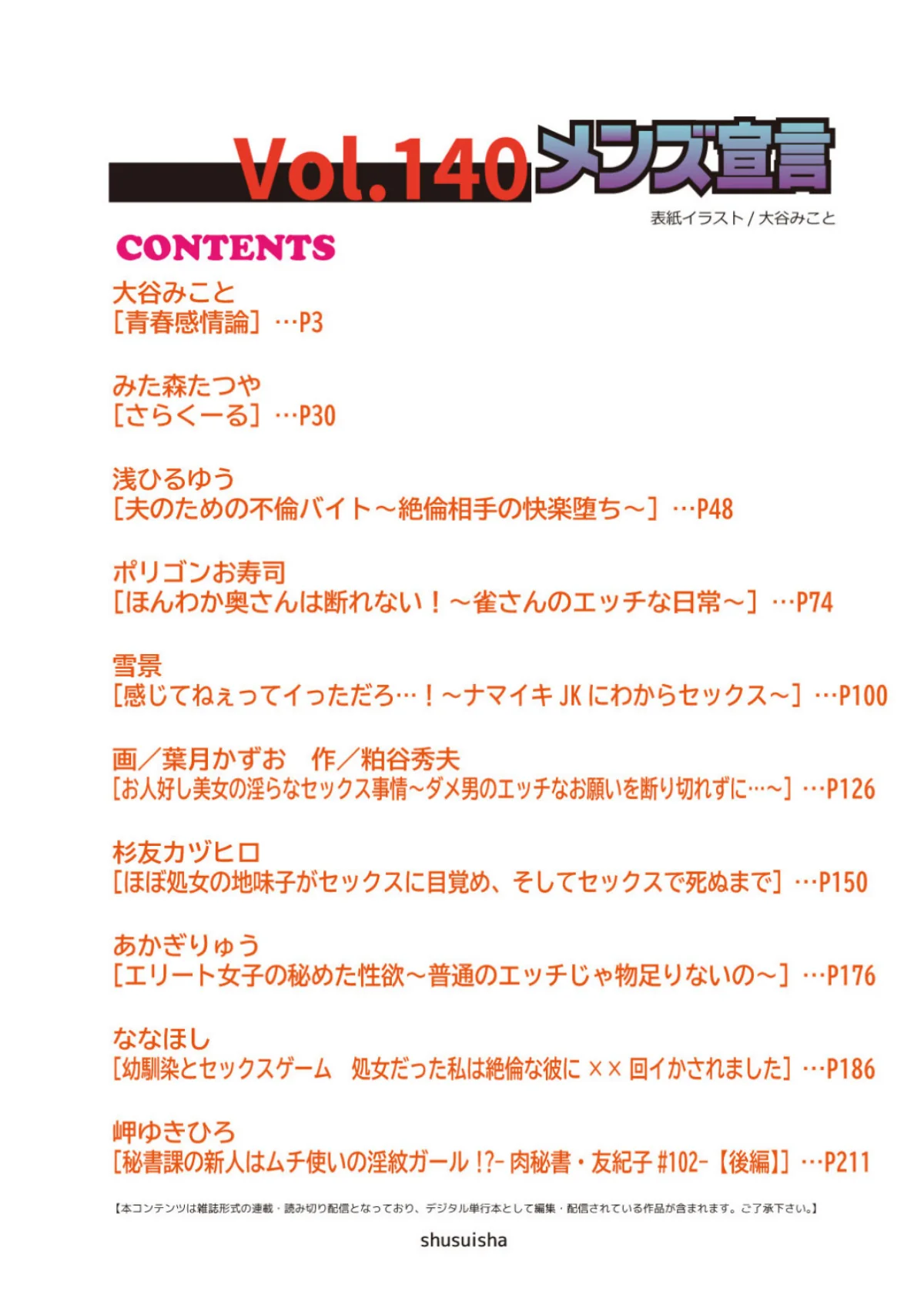 エロスの殿堂として知られるメンズ宣言の電子マンガ誌第140号。巻頭を飾る大谷みことの「青春感情論」をはじめ、人妻の不倫を描いた浅ひるゆうの作品、断れない性格の奥さんを主人公にしたポリゴンお寿司の日常系エロコメディ、生意気なJKとのやり取りを描いた雪景の学園もの、エリート女性の隠された欲望を描いたあかぎりゅうの作品、幼馴染との関係を描いたななほしの青春ストーリーなど、多彩なシチュエーションの作品を収録しています。充実のラインナップで様々な嗜好に対応した大人向けマンガ誌です。