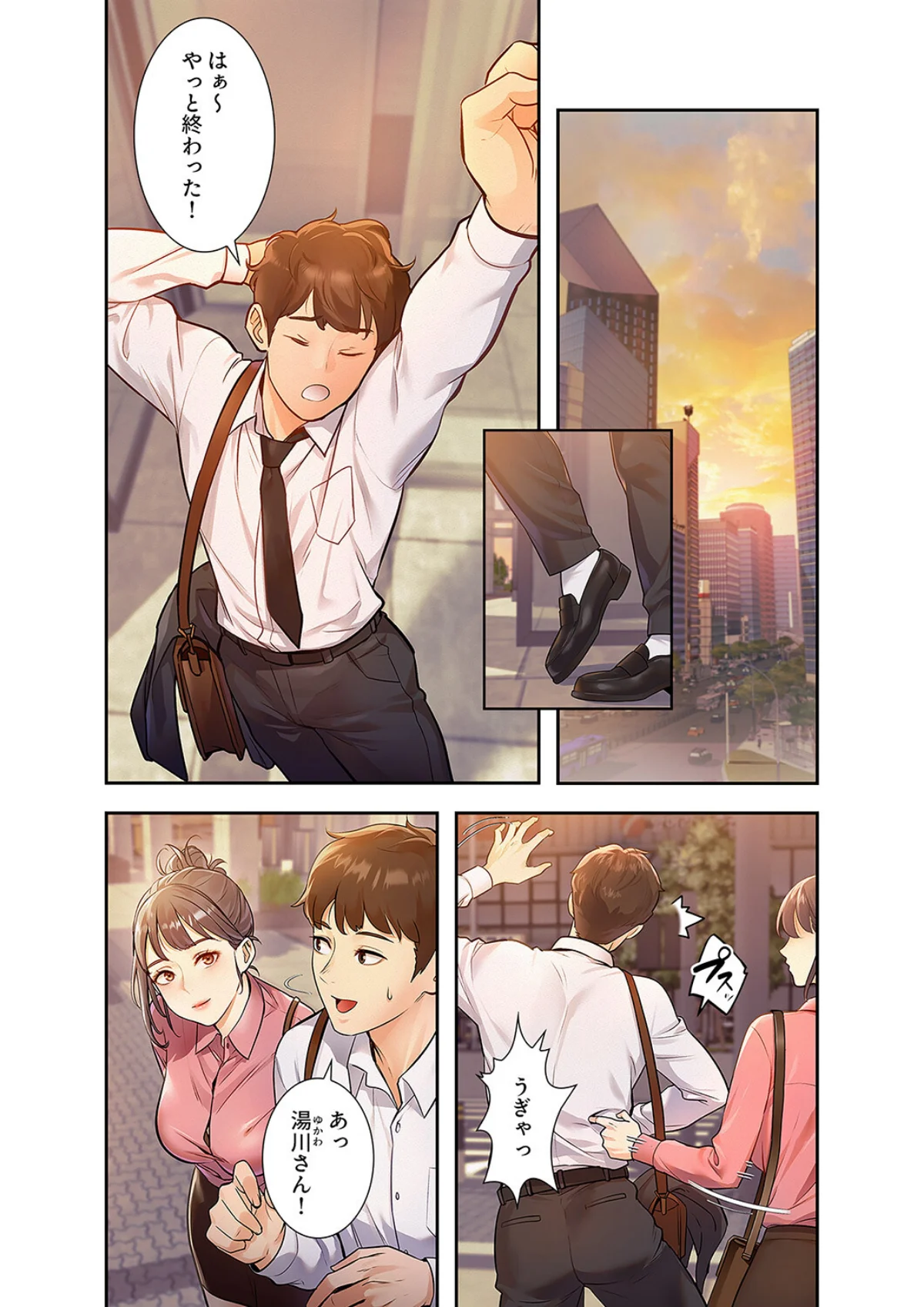 この作品の最大の武器は、「世界のルールそのものがエッチな方向に変わっている」という設定の強度にあります。主人公が異常に気づく瞬間——コンビニで店員が薄着どころかほぼ裸で接客している光景——から始まり、地下鉄、職場と舞台が変わるたびに「この世界の常識ってどこまで狂ってるんだ?」と期待感が積み上がっていく構成が見事です。単なるお色気シーンの羅列ではなく、世界観の積み上げとエロシーンが連動しているので、読んでいて飽きがきません。「日常の中に突然エロが侵食してくる」感覚は、ありきたりな設定ものとは一線を画していて、ページをめくる手が止まらなくなります。秘密を共有するような独特の緊張感が、井上と読者の間にじわじわと生まれてくるのも面白いポイントです。