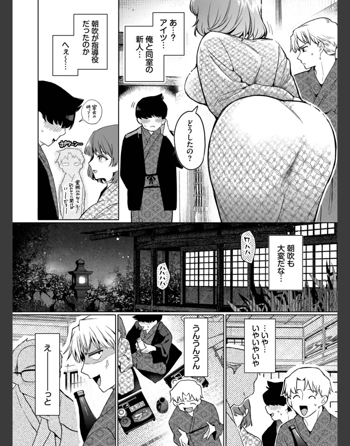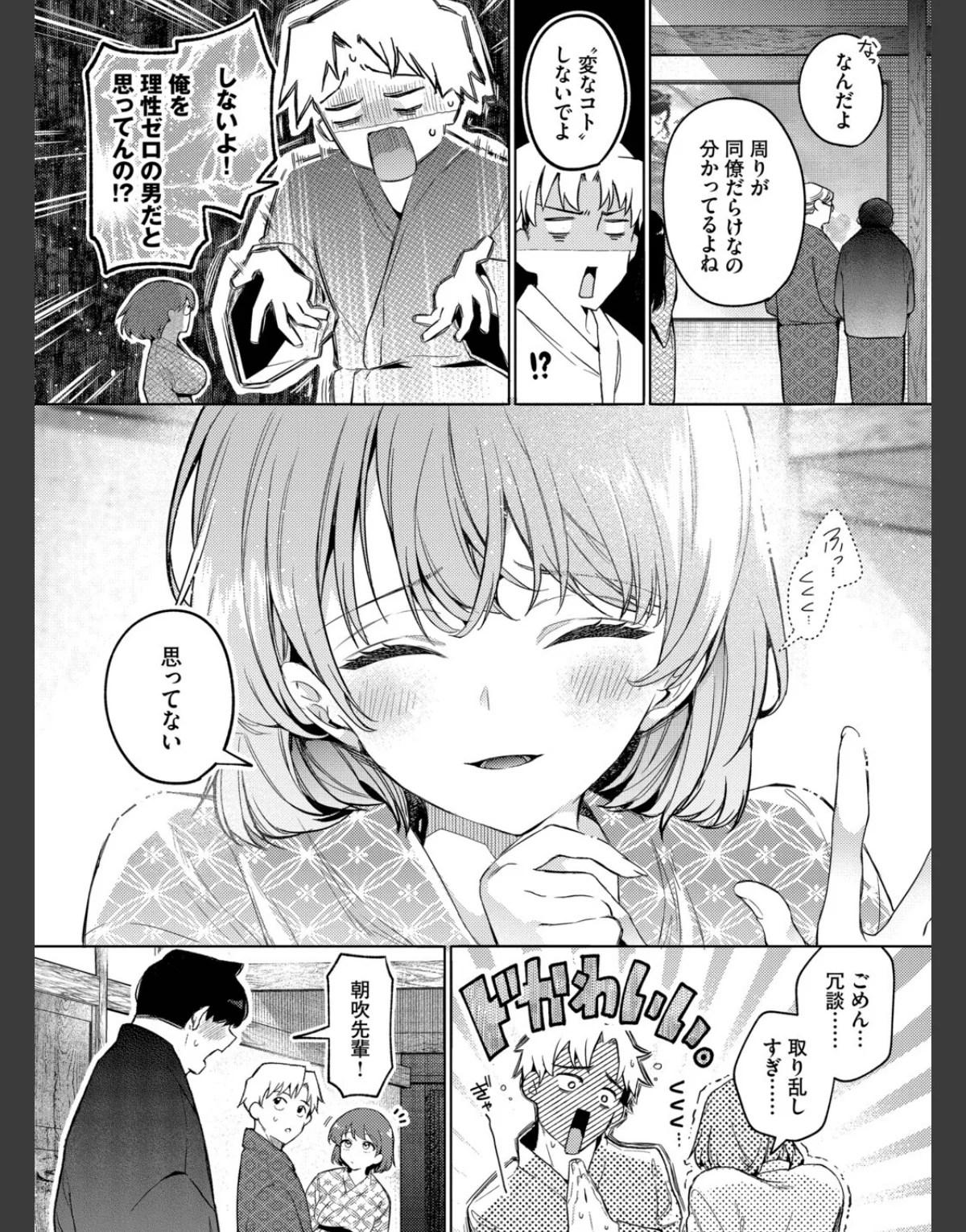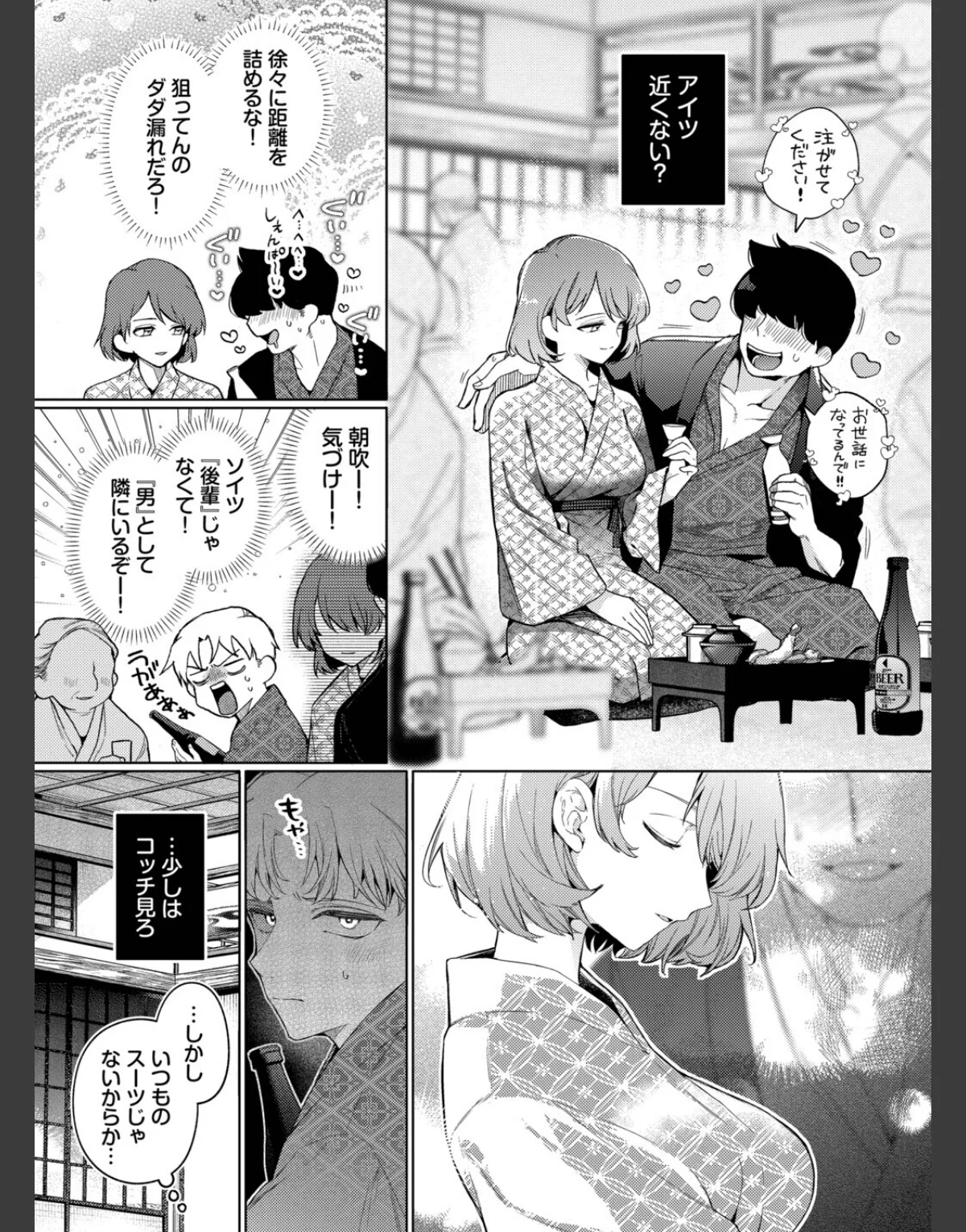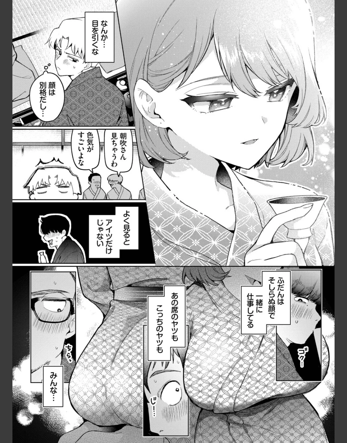 クール系OLの朝吹と主人公・三崎が社員旅行での密着したひとときを描く作品です。浴衣姿の朝吹に心惹かれながらも、彼女の後輩との距離にイライラする三崎。宴会で飲みすぎてしまった彼は、朝吹に介抱される中、思わぬ展開に。押し入れに隠れた二人が繰り広げる背徳的なセックスは、巨乳でスレンダーな朝吹の魅力を引き立てます。美乳とOLのシチュエーションが絶妙に絡み合い、ドキドキの恋模様が楽しめる作品です。