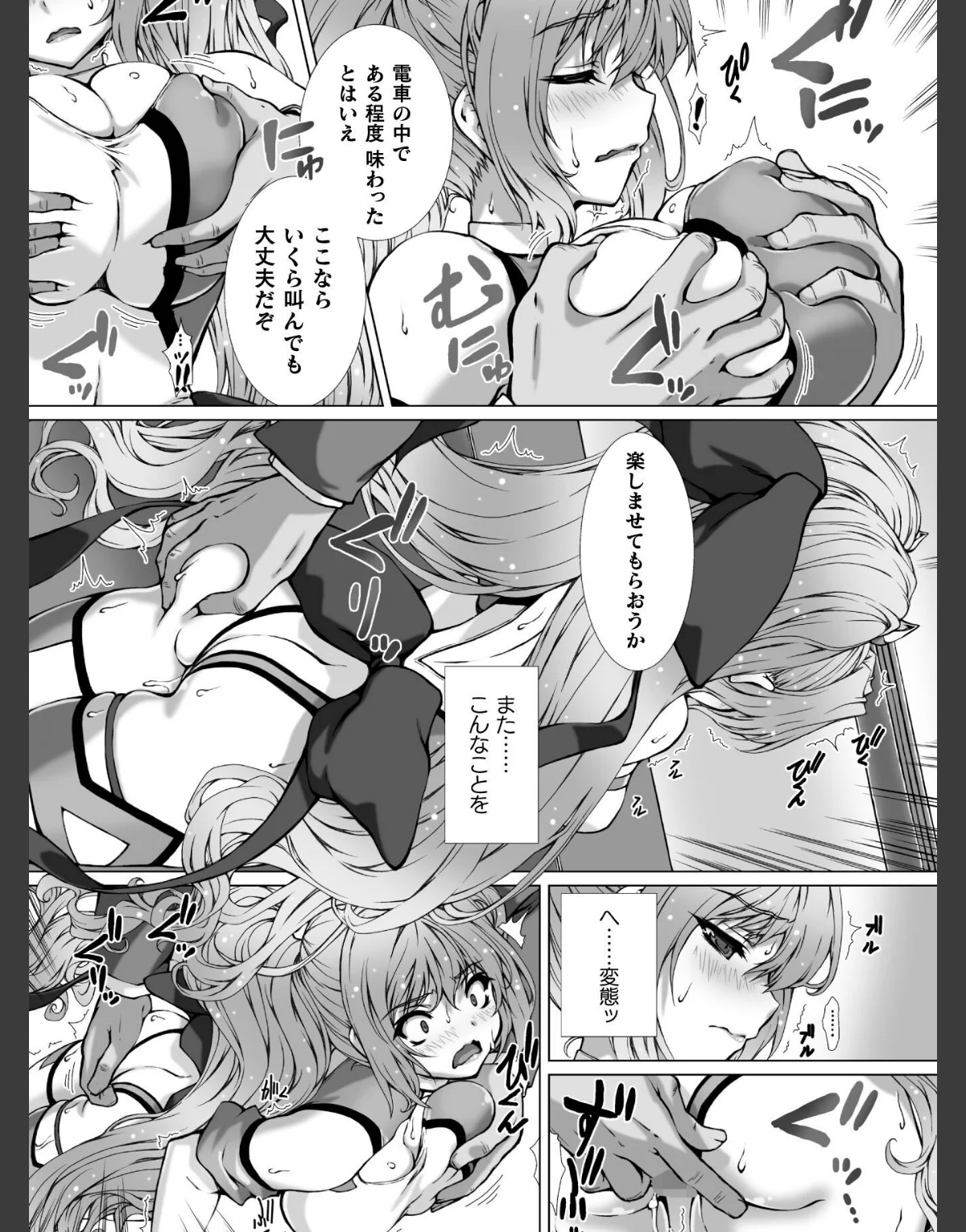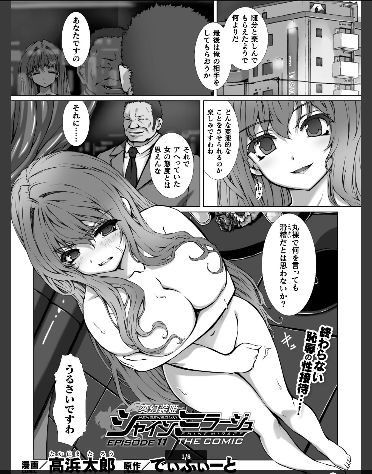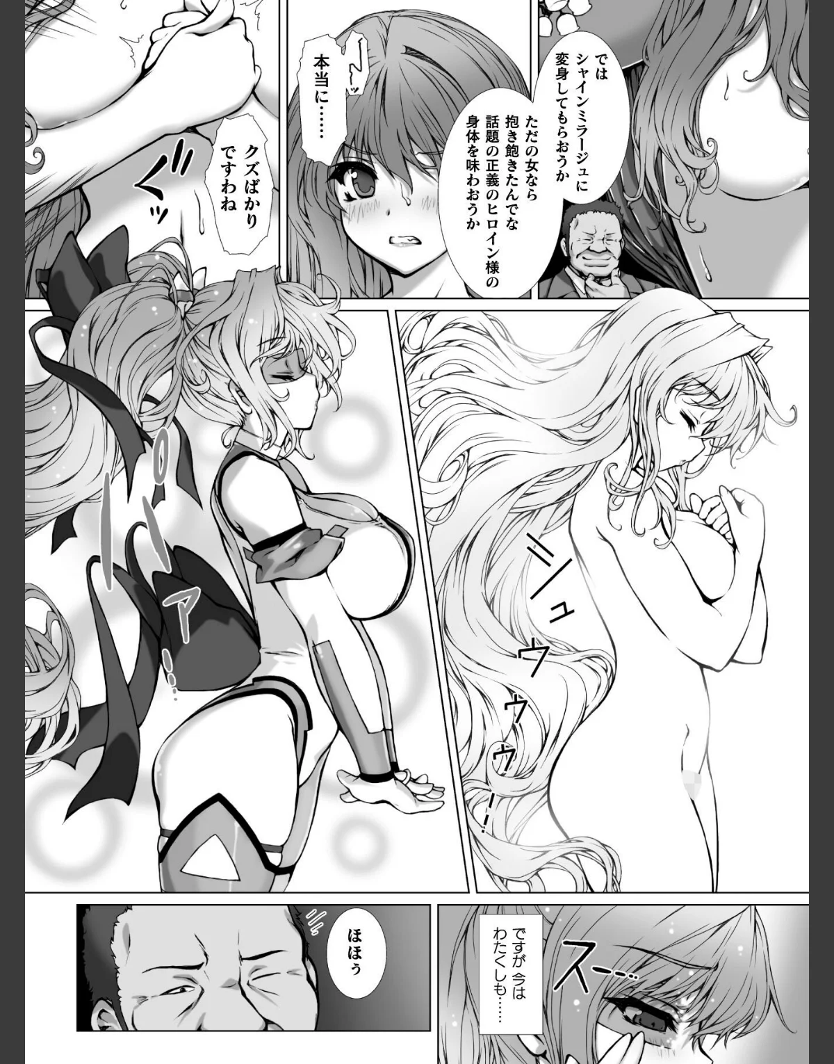 正義の変身ヒロイン「変幻装姫シャインミラージュ」として戦う東堂院紗姫は、コスプレデリヘル嬢に堕ちても誇りを持ち続ける令嬢ヒロインです。彼女は黒幕・黒田剛造に強制される「恋人プレイ」に苦しみながらも、悦楽に抗えず、幾人もの中年客に変態調教されていきます。ホテルの最上階での「窓際露出プレイ」中にダーククライムの戦闘員を発見するも、母乳やアナル奉仕が止まらず、葛藤する姿が描かれています。