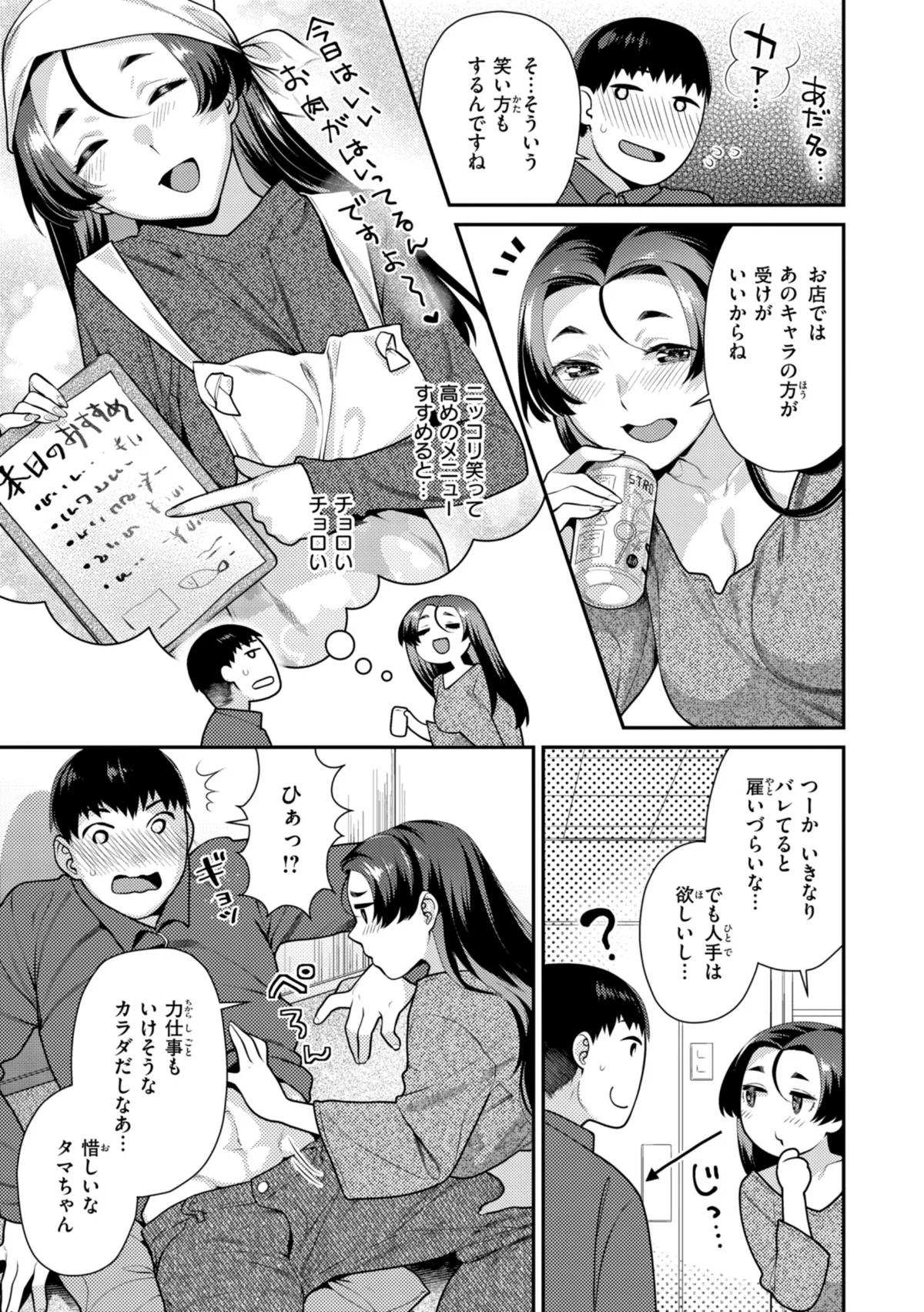 ねこまたなおみ先生の真骨頂とも言える、ムチムチした女体の描写力が圧倒的です。あらすじにもある通り「重力感たっぷり!ぷるんと揺れる大きなおっぱい」の表現は、まさに紙の上に立体感を生み出しています。揺れる胸の動きをコマ送りで追うコマ割りが秀逸で、静止画なのに動いているような錯覚を覚えるほどです。また「やらか〜くて触りたくなる肉付きのいいおなかまわり」の描写も絶品で、指先で触れたときの柔らかさまで伝わってきそうな質感表現がたまりません。巨乳を意識するヒロインのしぐさや動作がコマごとに丁寧に描き込まれており、体型への意識の高さとそれがもたらす色気が見事に表現されています。