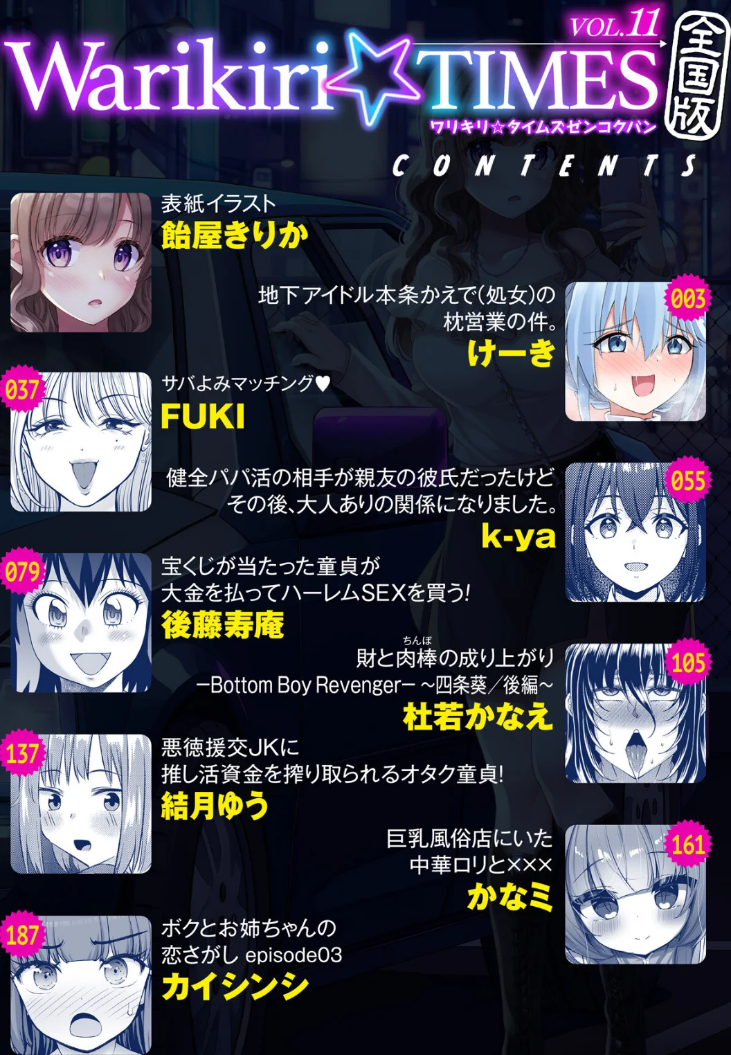 電子書籍専売雑誌「Warikiri★TIMES 全国版」VOL.11では、お金でマッチングした男女関係をテーマにした新作描き下ろし作品を収録します。地下アイドルが仕事のために枕営業を承諾する話、年齢を偽った年上女性との童貞卒業体験、親友の彼氏とのパパ活関係、宝くじ当選者のハーレム体験など、様々なシチュエーションが展開されます。制服姿のJKが援交で推し活資金を稼ぐ話や、風俗店での体験、恋とエッチの勉強を続ける三人の最終話まで、羞恥と快感に満ちた8作品を収録しています。