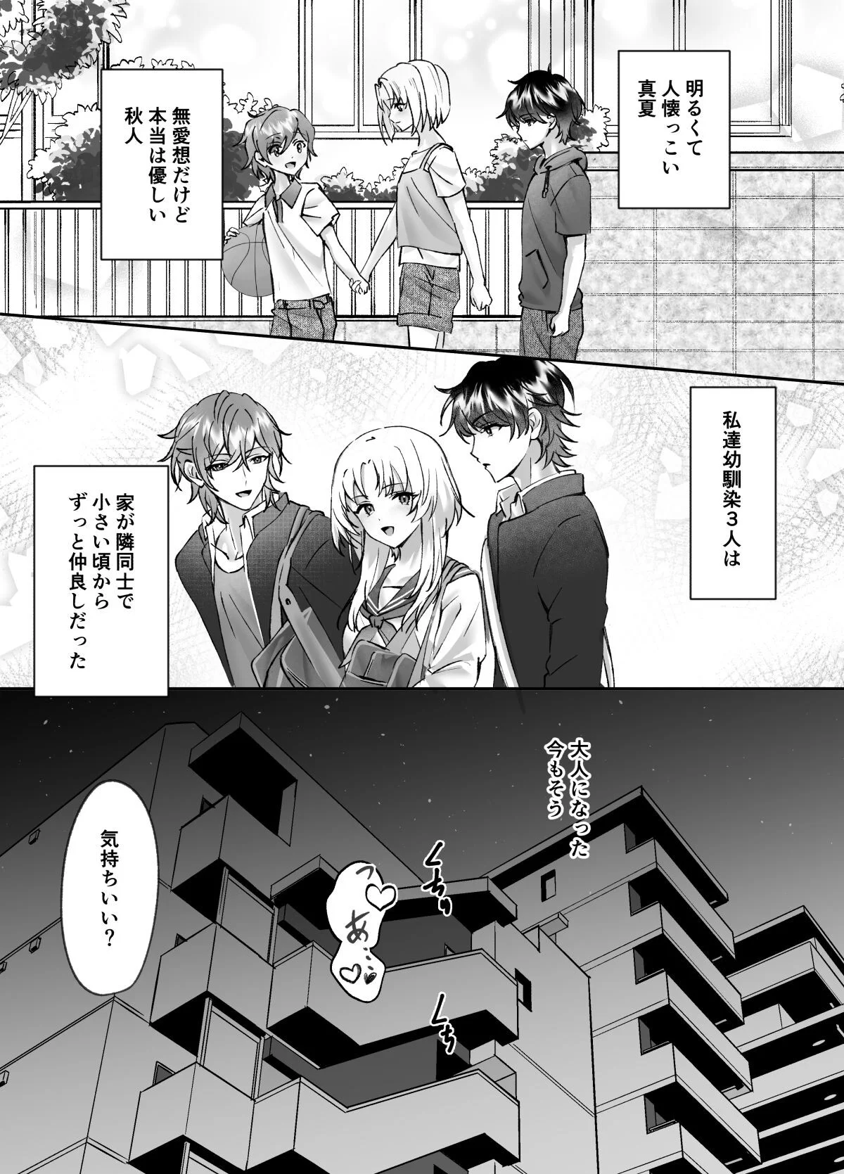 美冬、真夏、秋人の3人は、幼少期からの長い付き合いを持つ仲間です。それぞれの性格や魅力が絡み合い、エロティックなシーンに繋がる様子が非常に刺激的です。特に、2人の幼馴染から同時に愛撫されるシーンでは、体の細部までリアルに表現され、読者はそのドキドキ感を存分に味わうことができます。