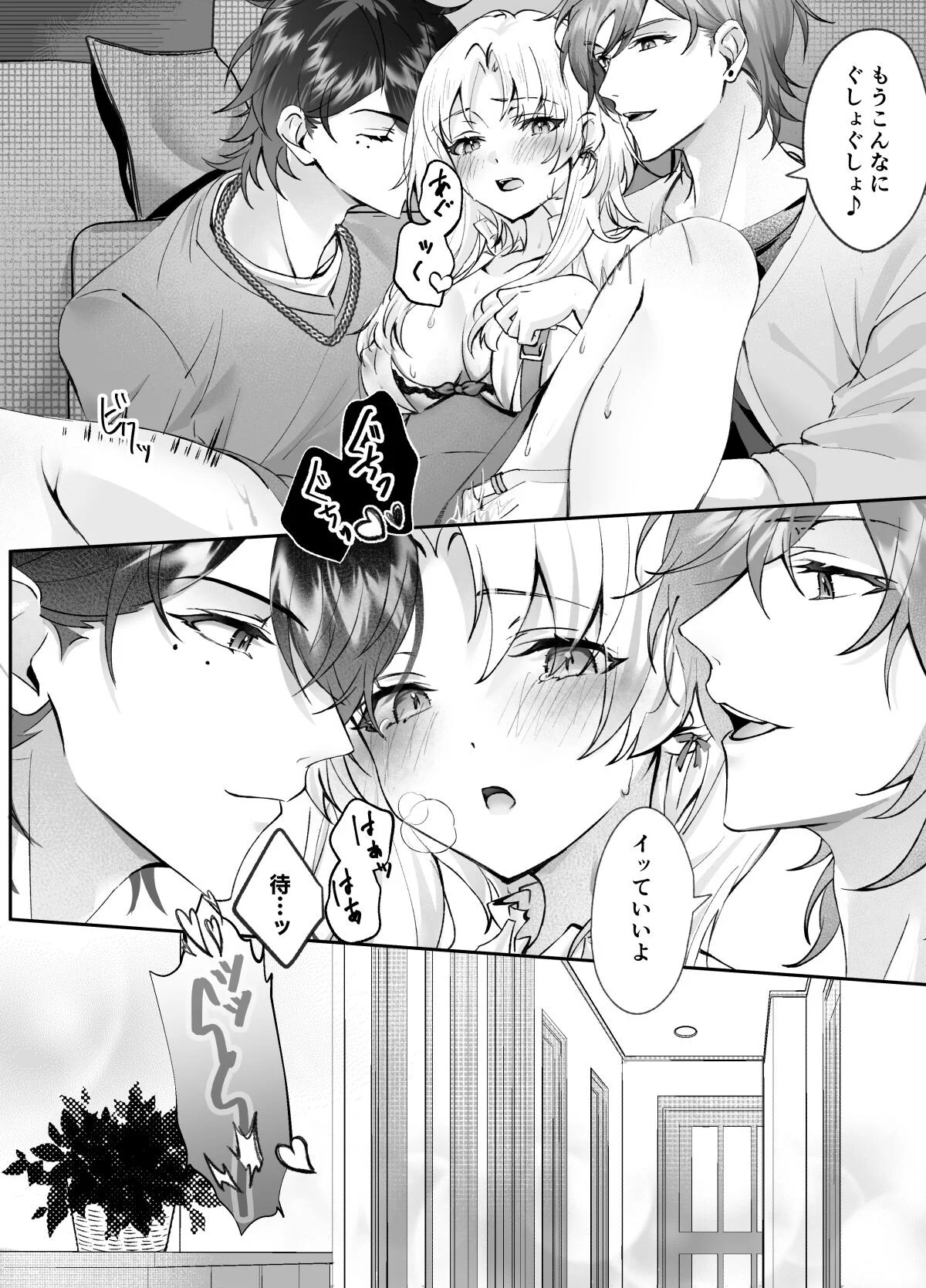 幼馴染の美冬、真夏、秋人の三人は、大人になっても特別な関係を続けています。明るく人懐っこい真夏と、無愛想ながら優しい秋人という異なる性格の二人と、美冬は同時に付き合うという歪な関係に陥っています。三人でのエッチが日常となり、快楽に溺れていく美冬は、二人からの愛撫や挿入によって、心も体も満たされていく様子が描かれています。彼女は、この快楽から逃れられない状況に身を委ねていきます。
